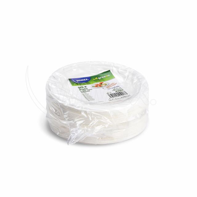 Okrúhly tanier z cukrovej trstiny, priemer 17,5 cm. Pevný, odolný a 100% biorozložiteľný. Balenie obsahuje 50 ks.