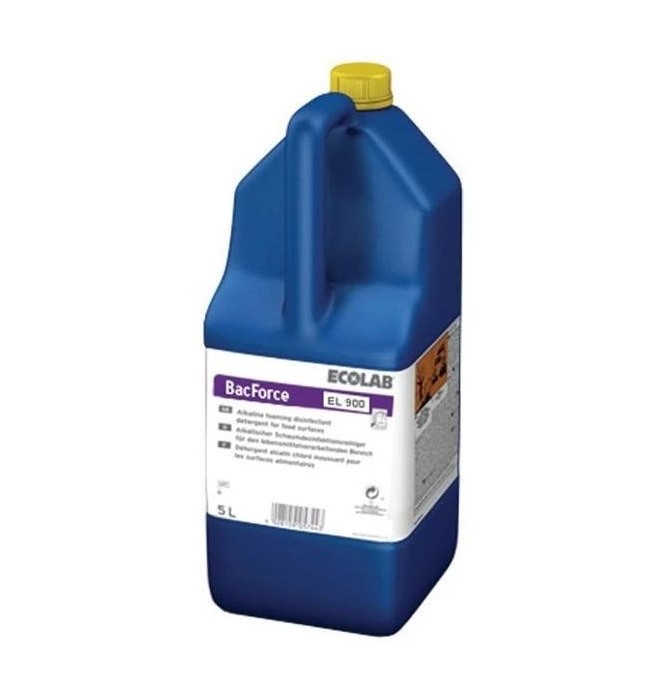 - BacForce EL 900 je zásaditý chlórový dezinfekčný čistiaci prostriedok, ktorý ľahko odstraňuje tuky, olej, bielkoviny, krv, zvyšky ovocia a ovocné škvrny zo všetkých vode odolných povrchov v oblastiach, kde sa manipuluje s potravinami. Zloženie peny zaručuje vynikajúcu priľnavosť na vertikálnych a šikmých plochách.BacForce EL 900 má baktericídny účinok podľa EN 1276 a fungicídny účinok podľa EN 1650.