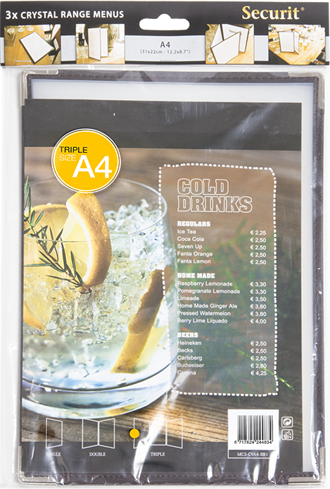 Priehľadný obojstranný jedálny lístok z antireflexnej hmoty bez dosiek. Tenký rámček v tmavo šedej farbe je vyrobený v dezéne kože, s ochrannými chrómovanými kovovými rožkami. Jedálny lístok je rozkladací s dvoma chrbtami. Jedálne lístky Crystal sa dodávajú vždy v sade po 3 kusoch.