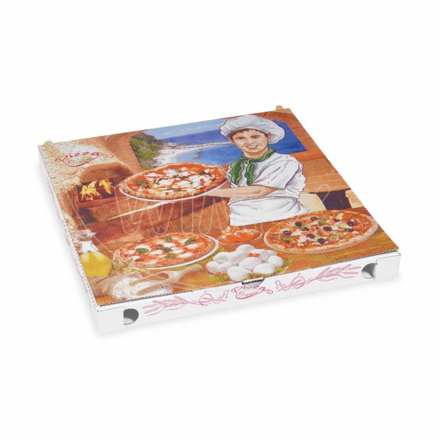 Krabica na pizzu z vlnitej lepenky s vetracími otvormi a pevným uzatváracím systémom. Ekologická, recyklovateľná a vhodná na bezpečný prenos pizze či iných pokrmov. Balenie 100 ks.