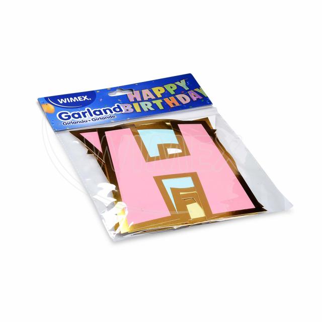 1 sada girlandy s farebnými písmenami "HAPPY BIRTHDAY" (16 x 20 cm) a 5 m šnúrky na zavesenie.Kód dodávateľa: 66807