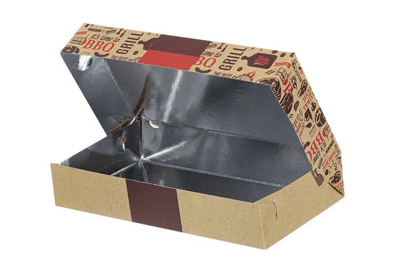 Box má ALU vnútorné potiahnutie,ktorého výhodou je vyššia odolnosť, dlhšie udržanie teploty jedla a zachováva chute nedotknuté arovnako výrazné. V porovnaní s obyčajným hliníkom, metalizovaný PET, ktorý bol použitý pre tento food box,chráni potraviny pred nebezpečnými emisiami hliníka pri kontakte s potravinami, ktoré sú príliš slané alebo kyslé, ako je to bežné v prípade grilovaných potravín.Vhodné do teploty max. 70°C.