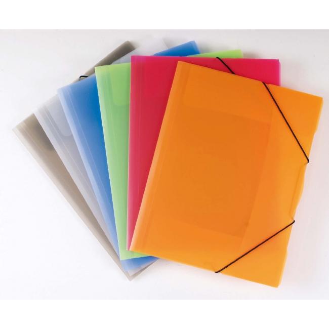 Plastový obal formátu A4 stromi chlopňami zosilného polypropylénu hrúbky 500µm sgumičkou. Väčšie balenie 50ks. Módna farba.