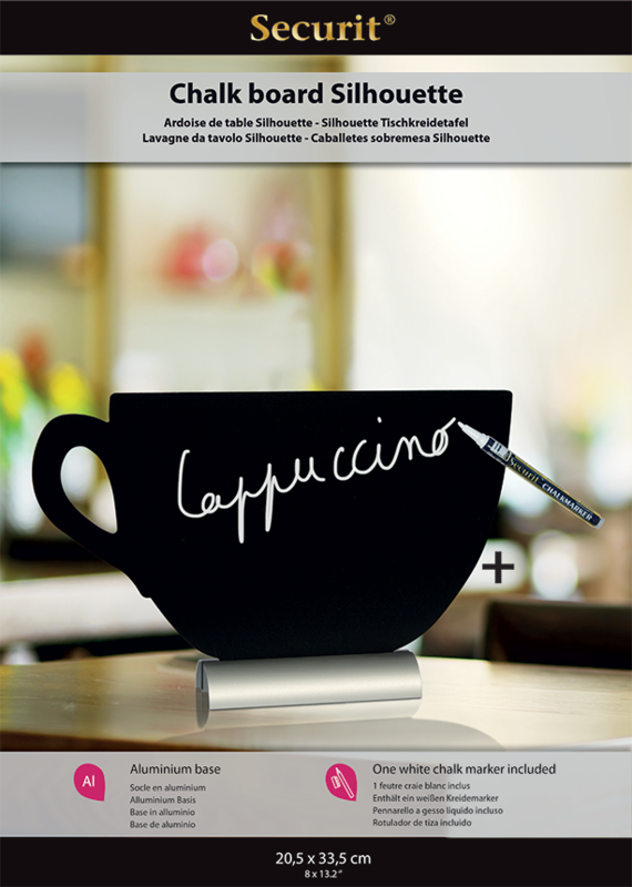Súčasťou balenia je tvarovaná tabuľka + hliníkový stojan + 1 x biely popisovač.