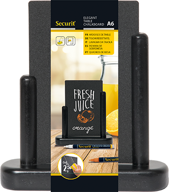 Stolové ponukové tabule majú stojančeky a rámčeky z tvrdého kvalitného dreva s povrchovou úpravou odolnou proti poveternostným podmienkam. Povrch tabuliek je neporézny, ideálny na použitie popisovačov Securit. Napísané texty sú v tejto kombinácii odolné pôsobeniu vody, rozmazaniu a zašpineniu pri bežnom používaní. Popisovacie tabuľky výmenné - pre čo najľahšie použitie pri často opakujúcej sa ponuke. V prípade potreby stačí tabuľky vybrať a nasadiť tie s aktuálnou ponukou.