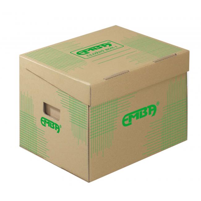 Úložná škatuľa s výklopným vrchnákom z hnedej vlnitej lepenky so zelenou potlačou. Určená na uloženie voľne vložených spisov formátu A4. Rozmery š330xd300xv240 mm.