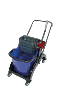 Upratovací vozík PLASTOVÝ, 2x25l vedrá, s KOVOVÝM žmýkačom - šedo-červeno-modrý, bez vanič je ideálne pre reštaurácie, hotely, kaviarne, kancelárie a domácnosti. Poskytuje spoľahlivé výsledky pri každodennom používaní.